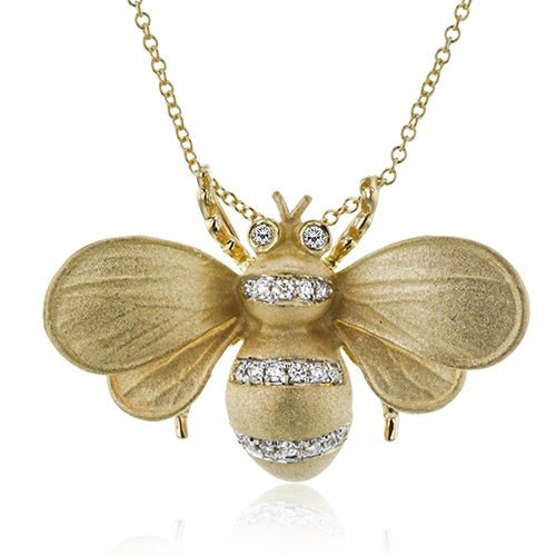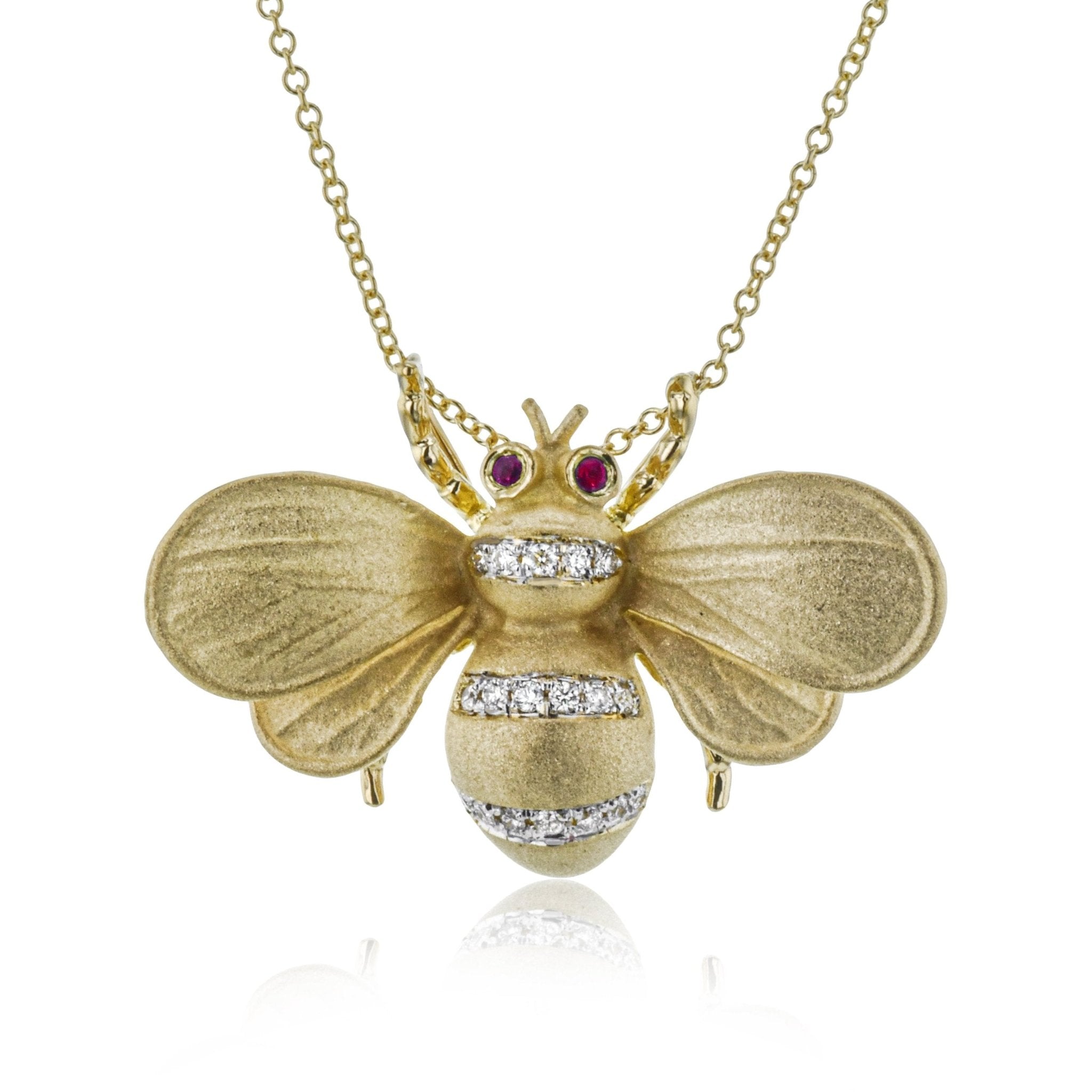 This beautiful bee pendant hangs on gold chain and features a brushed texture finish along with diamonds. Choose from yellow gold with emerald eyes or gray gold with sapphire eyes.