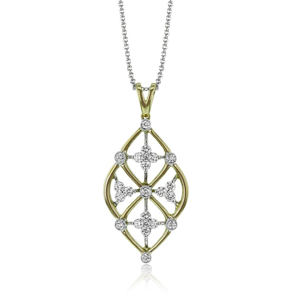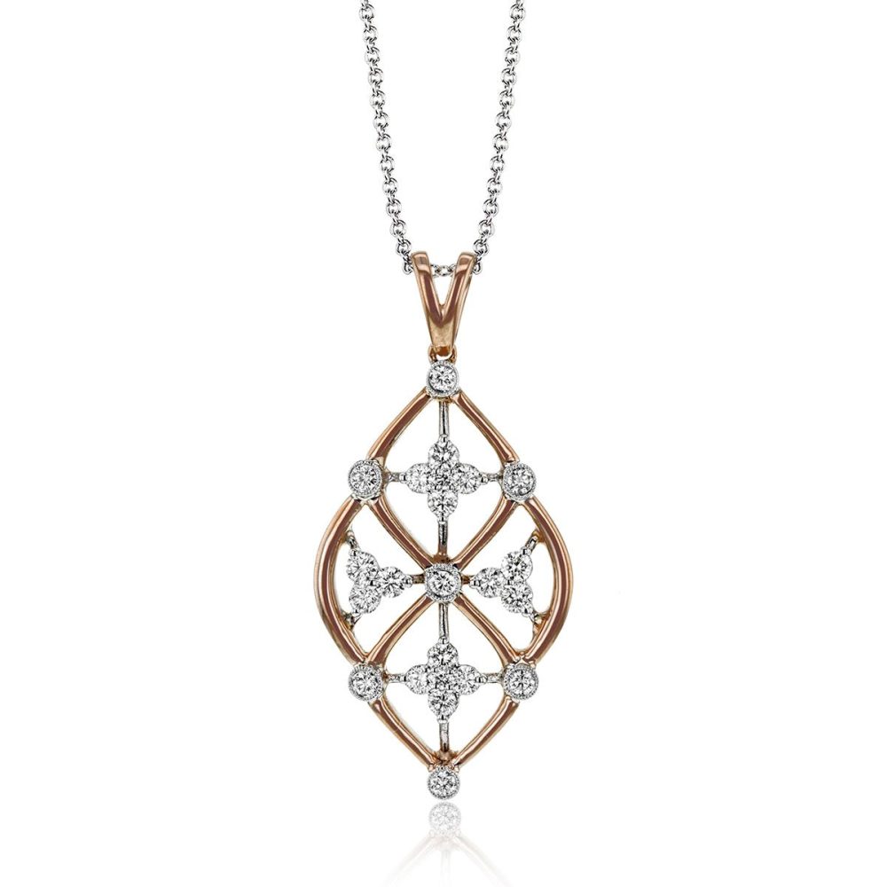 This pendant’s ornate openwork in two-tone gold is accentuated by intricately set sparkling diamonds.